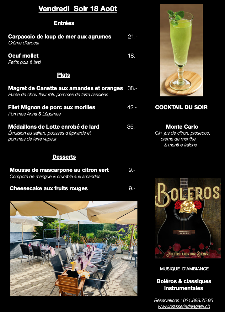 Brasserie De La Gare in Montreux offers a delightful blend of classic and contemporary flavors that cater to a variety of tastes. Their menu highlights include the Mousse Citron Vert Est Mangue, a refreshing and tangy dessert that perfectly balances the zest of lime with the sweetness of mango. For a savory experience, the Pommes de Terre Grenailles are a standout, with tender baby potatoes cooked to perfection, providing the ideal side dish to complement any main course. The Filet de Bar Grillé Au Prosecco is another must-try, featuring a beautifully grilled seabass fillet enhanced with a delicate prosecco sauce, offering a luxurious twist on a traditional seafood dish. The restaurant’s diverse menu, which combines bold flavors with refined techniques, makes it a fantastic choice for those seeking both comfort and sophistication in their dining experience.